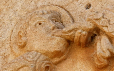 In the western facade of the church of San Pedro Burgos de Tejada, surprising iconography carved in low relief on hollow baseboards, showing Christ sitting at the table with only two of the Apostles: Judas, right and left John .